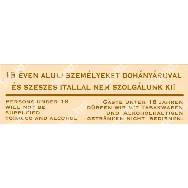 | 18 éven aluli személyeket dohányáruval és szeszesitallal nem szolgálunk ki! tábla (bézs/barna, 3 nyelvű) 250x80 mm UZT036001PVC02500080 | PVC 1 mm | 250 mm | 80 mm | 1 mm | db | 545 Ft | 692 Ft |