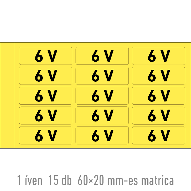 | 6 V matrica 60x20 mm ERV120001ONV00600020 | vinil öntapadó | 60 mm | 20 mm | 0.2 mm | ív | 275 Ft | 349 Ft |