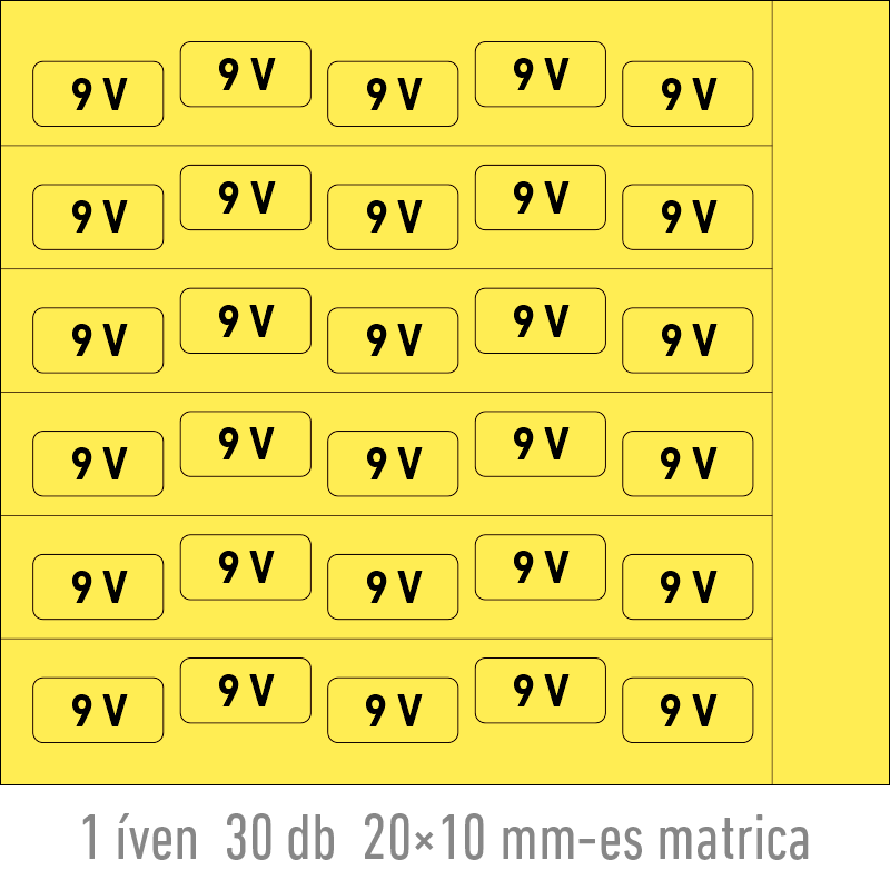| 9 V matrica 20x10 mm ERV121001ONV00200010 | vinil öntapadó | 20 mm | 10 mm | 0.2 mm | ív | 330 Ft | 419 Ft |