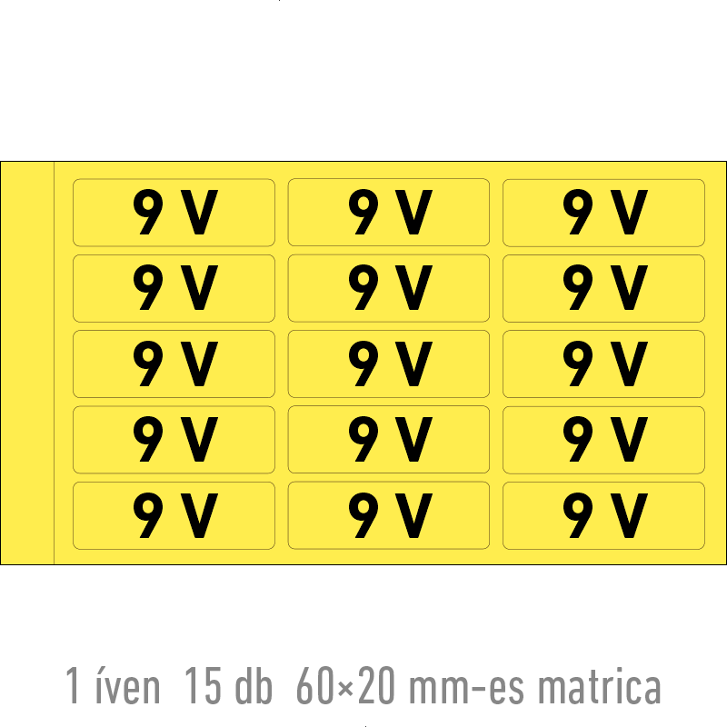 | 9 V matrica 60x20 mm ERV121001ONV00600020 | vinil öntapadó | 60 mm | 20 mm | 0.2 mm | ív | 275 Ft | 349 Ft |