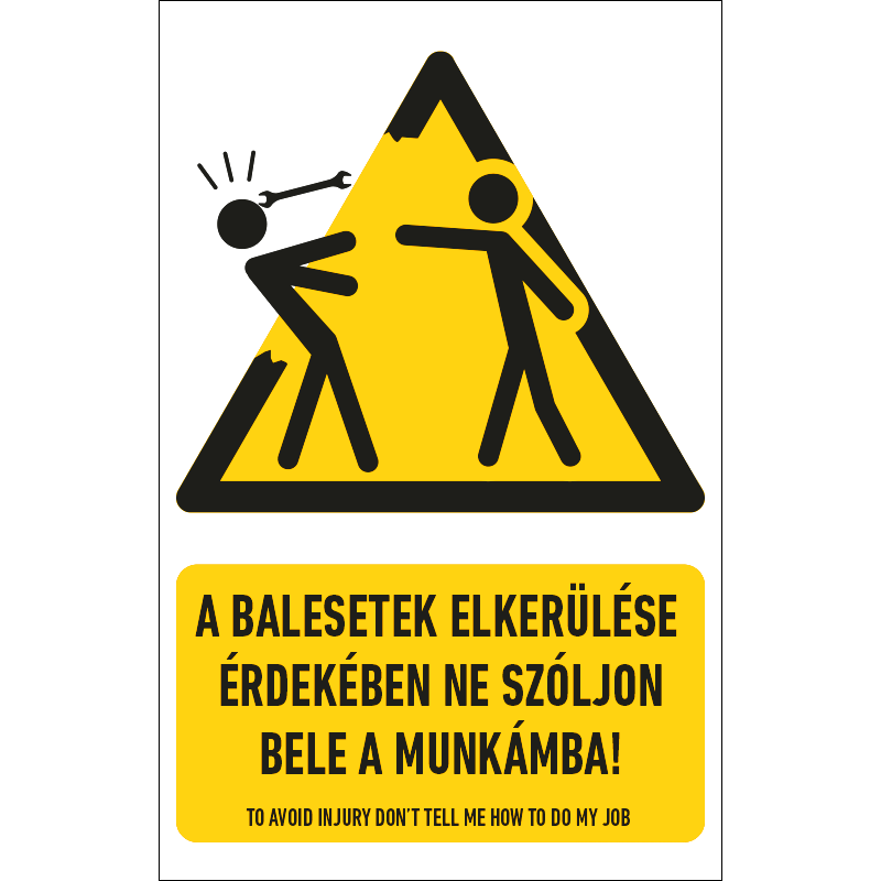 “A balesetek elkerülése érdekében ne szóljon bele a munkámba!” vicces figyelmeztető piktogram+felirat.