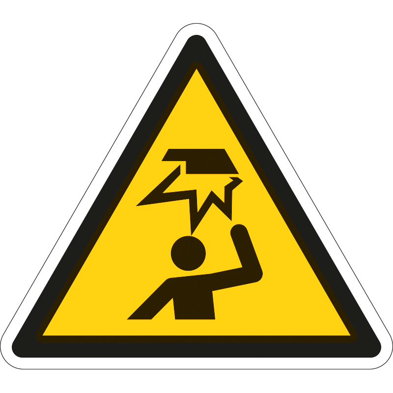 “A fej sérülésének veszélye” a fejmagasságban lévő tárgyak okozta sérülés veszélyére figyelmeztető piktogram.