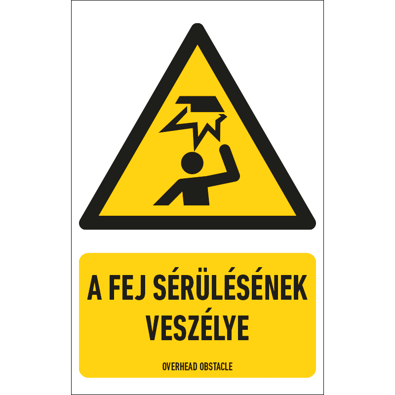 “A fej sérülésének veszélye” a fejmagasságban lévő tárgyak okozta sérülés veszélyére figyelmeztető piktogram+felirat.