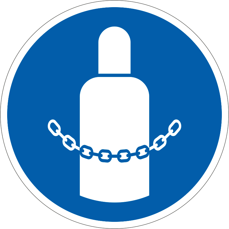 A “Gázpalackok rögzítendők!” a munkaterületen elhelyezett gázpalackok helyes tárolásáról rendelkező kék alapon fehér piktogram.