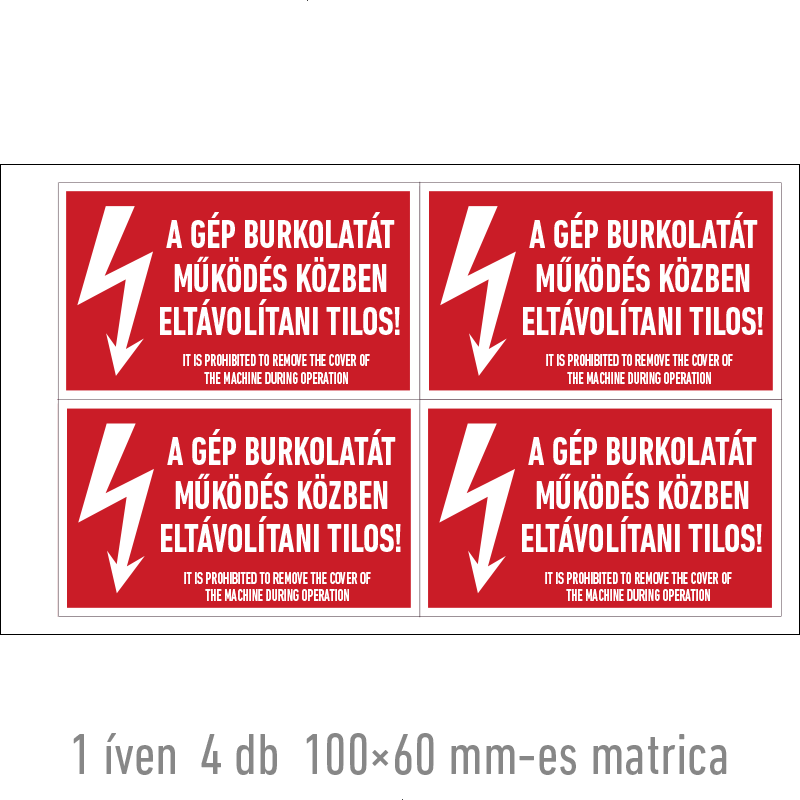 | A gép burkolatát működés közben eltávolítani tilos! matrica 100x60 mm ERV080002ONV01000060 | vinil öntapadó | 100 mm | 60 mm | 0.2 mm | ív | 275 Ft | 349 Ft |