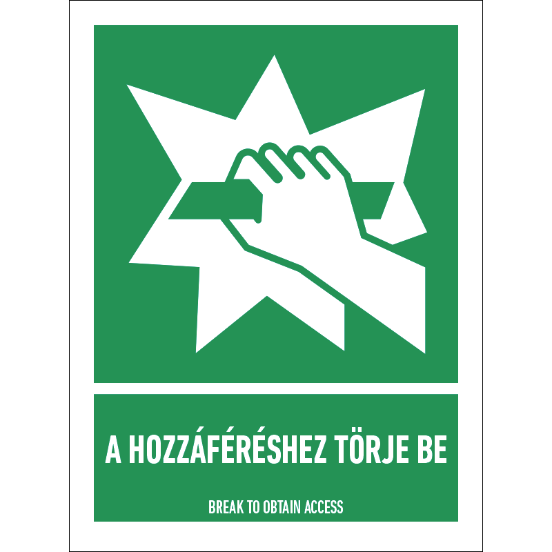 “A hozzáféréshez törje be!” a védőburkolat betörésére a figyelmet felhívó zöld alapon fehér piktogram.