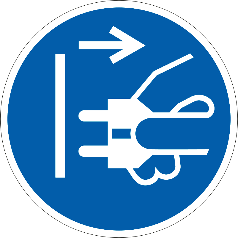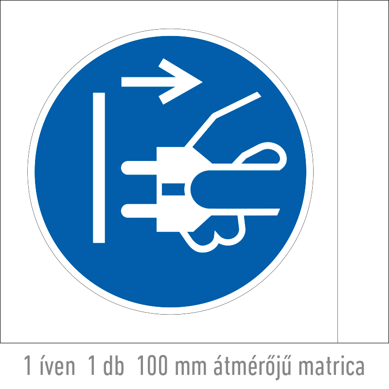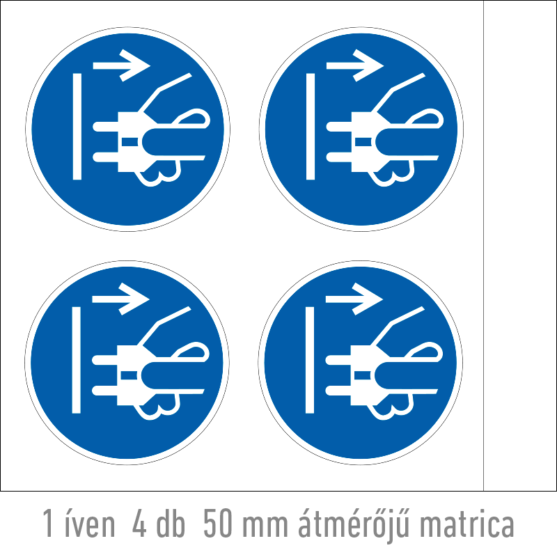 “A készülék nyitás előtt áramtalanítandó!” a munkaterületen a biztonság betartására vonatkozik: a készülék nyitás előtti áramtalanítására utasító kék alapon fehér piktogram.