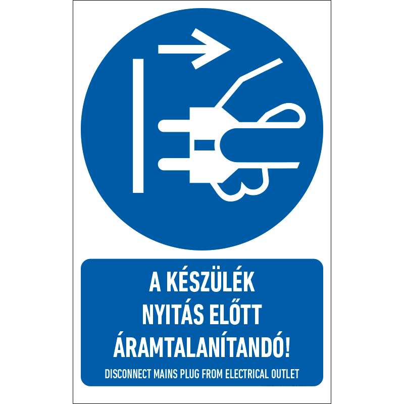 “A készülék nyitás előtt áramtalanítandó!” a munkaterületen a biztonság betartására vonatkozik: a készülék nyitás előtti áramtalanítására utasító kék alapon fehér piktogram+felirat.