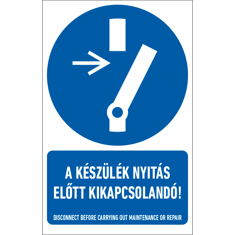 “A készülék nyitás előtt kikapcsolandó!” a munkaterületen a biztonság betartására vonatkozik: a készülék nyitás előtti kikapcsolására utasító kék alapon fehér piktogram+felirat.