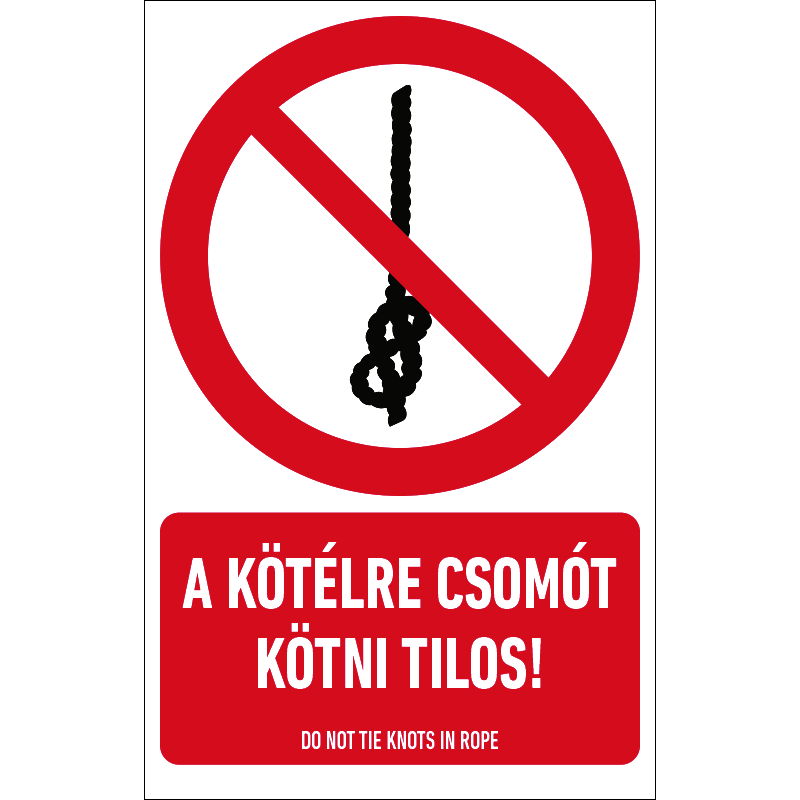 | A kötélre csomót kötni tilos! mtábla (ISO 7010-P030 piktogram + felirat) 160x250 mm TIT065001PET01600250 | PET-G 0,7 mm+kétoldalas ragasztó | 160 mm | 250 mm | 1 mm | db | 1100 Ft | 1397 Ft |