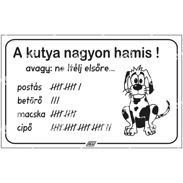| A kutya nagyon hamis! tábla 160x100 mm DEB001001PVC01600100 | PVC 1 mm | 160 mm | 100 mm | 1 mm | db | 625 Ft | 794 Ft |