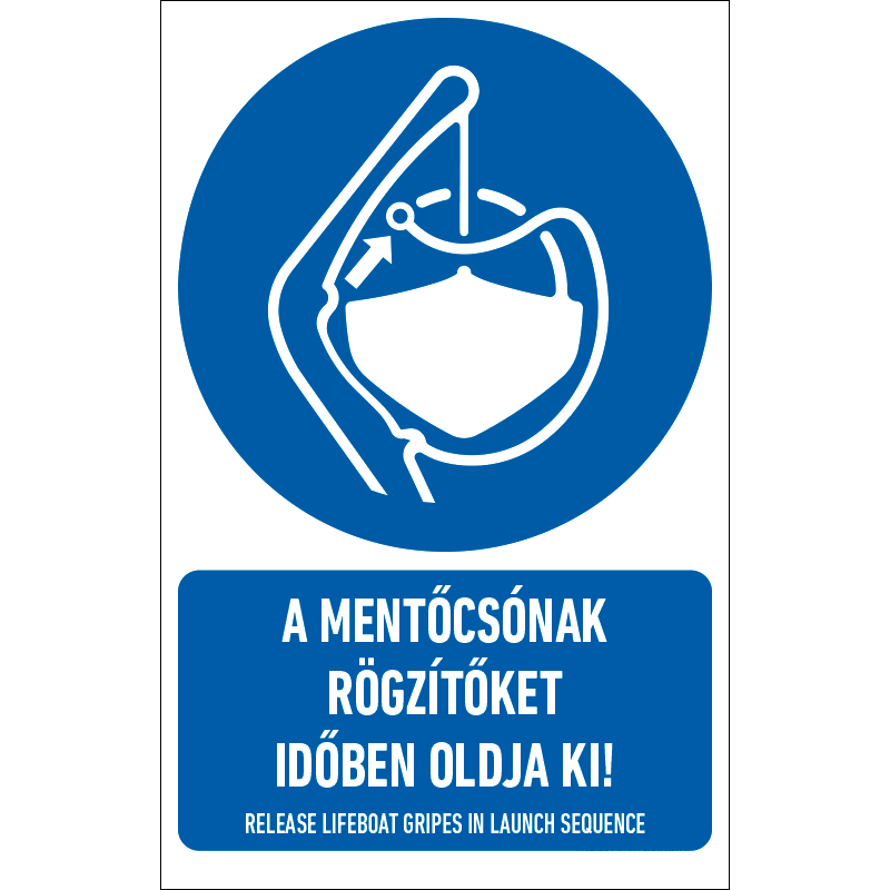 “A mentőcsónak rögzítőket időben oldja ki!” a biztonság és egészség védelmére vonatkozik: a mentőcsónak rögzítők időbeni kioldását előíró kék alapon fehér piktogram+felirat.