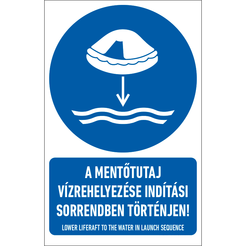 “A mentőcsónak vízrehelyezése indítási sorrendben történjen!” a biztonság védelmére vonatkozik: a mentőcsónak megfelelő vízrehelyezése előíró kék alapon fehér piktogram+felirat.