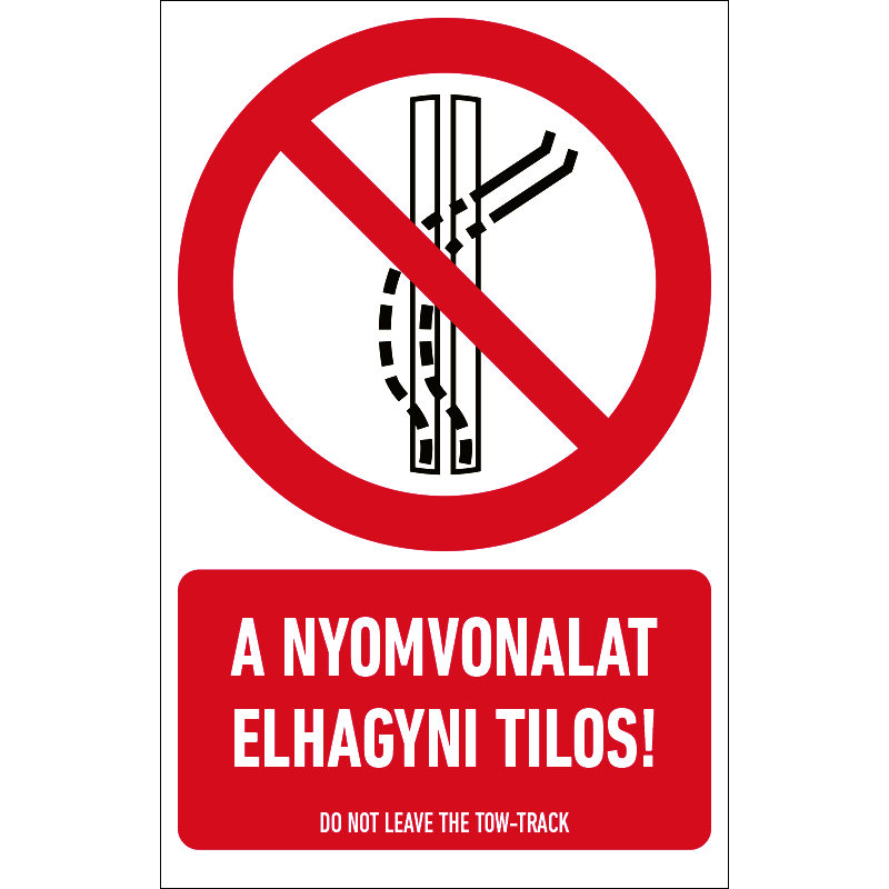 “A nyomvonalat elhagyni tilos!” a nyomvonal elhagyását tiltó piktogram+felirat.