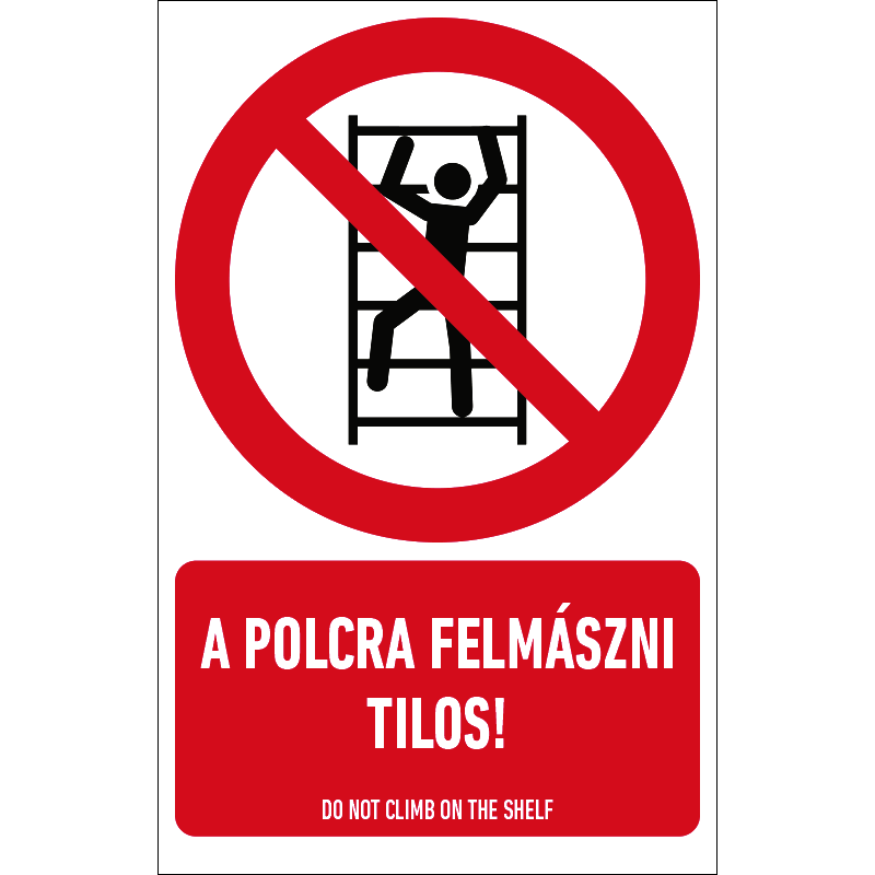 “A polcra felmászni tilos!” a polcra mászást tiltó piktogram+felirat.