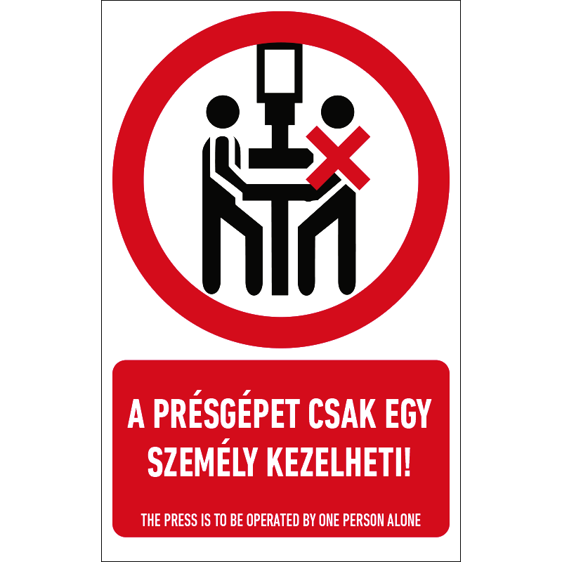 “A présgépet csak egy személy kezelheti!” a présgépet kezelő személyen kívül más közreműködését tiltó piktogram+felirat.