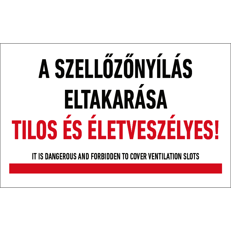 “A szellőzőnyílás eltakarása tilos és életveszélyes!” a szellőzőnyílás eltakarását tiltó felirat.