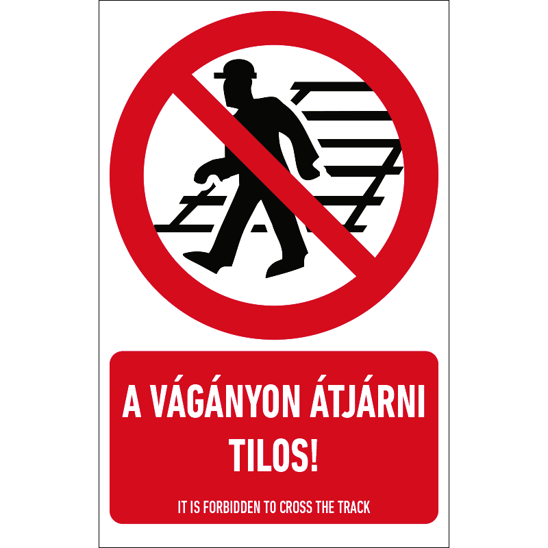 “A vágányon átjárni tilos!” a vasúti vágányokon történő átjárást tiltó piktogram+felirat.