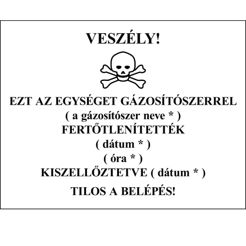 A gázosítószeres fertőtlenítésre figyelmeztető jelzésen a csillaggal jelölt adatokat megrendelés esetén meg kell adni!