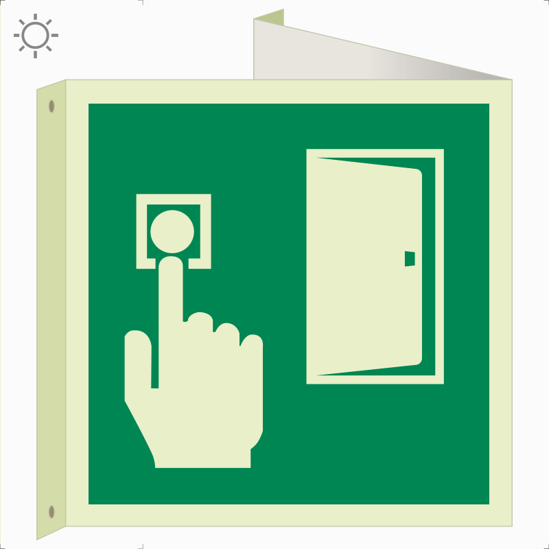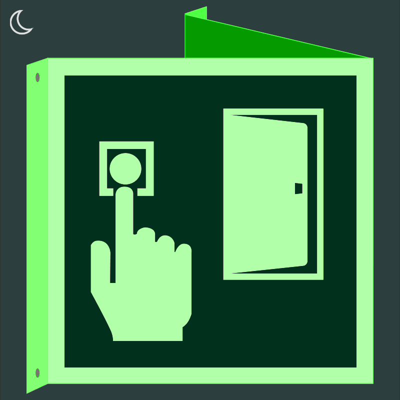 Az “Ajtó vésznyitó” a menekülési ajtó vészhelyzeti nyitógombjának helyét jelző zöld lapon fehér piktogram.