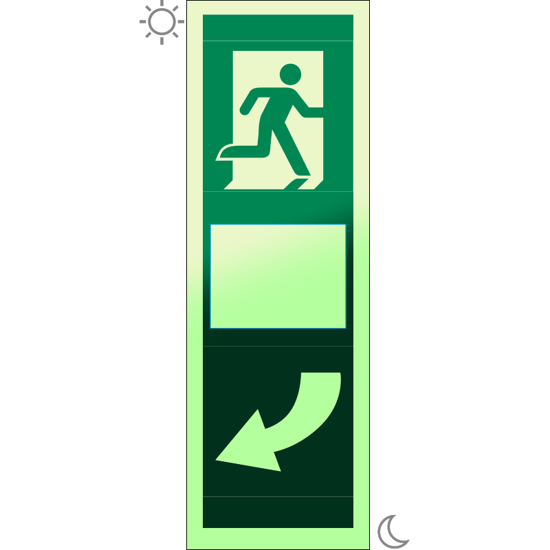 Az “Ajtókilincs” az ajtókilincseket és nyitási irányukat a sötétben utánvilágítva jelző zöld alapon fehér piktogram.
