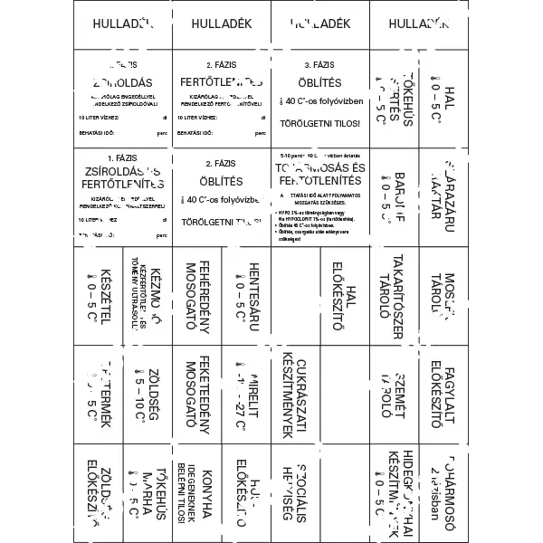 Alap köjálos szett matrica csomag (köjálos HACCP ÁNTSZ). Vendéglátóipari helyiségek konyháiba, büfékbe ÁNTSZ által előírt kötelező feliratkozások. Az alapszett matricákon a konyhákban lévő különböző hűtők hőmérséklete, a mosogatási fázisok és a helységek feliaratozása is megtalálható.