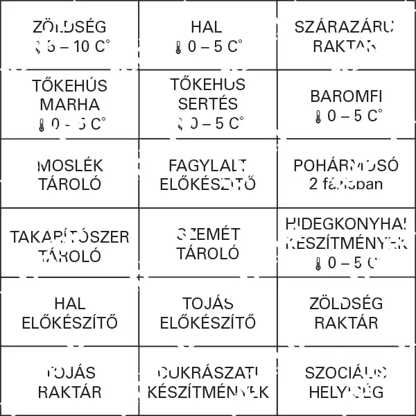 Kigészító köjálos szett matrica csomag (köjálos HACCP ÁNTSZ). Vendéglátóipari helyiségek konyháiba, büfékbe ÁNTSZ által előírt kötelező feliratkozások. A kigészítő matricákon a konyhákban lévő különböző hűtők hőmérséklete és helységek feliaratozása található.
