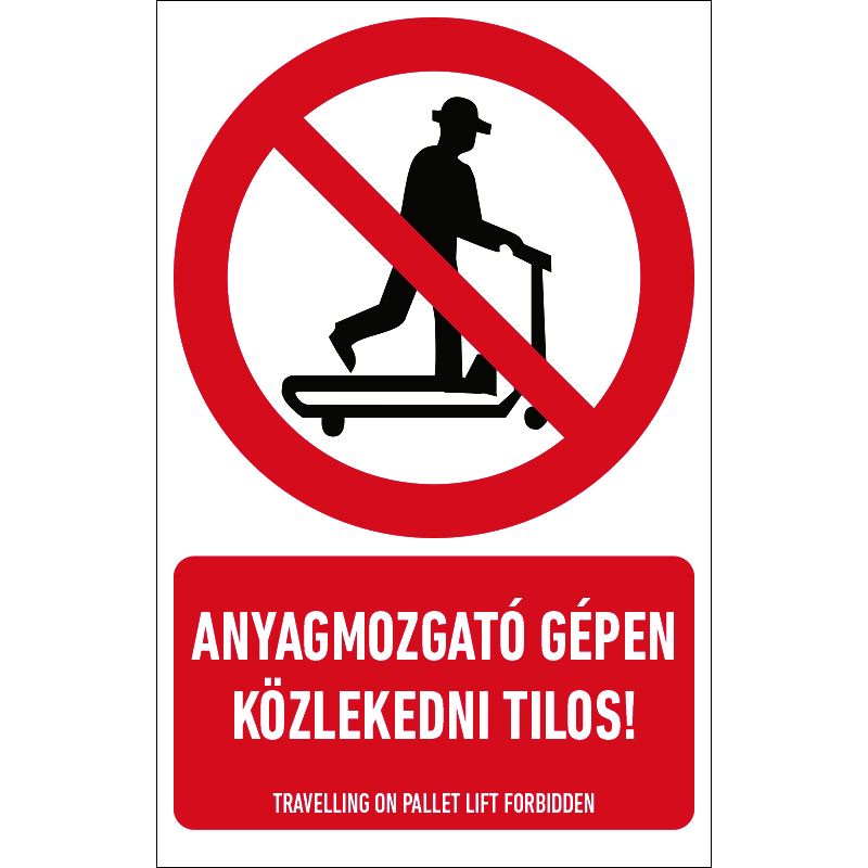 Az “Anyagmozgató gépen közlekedni tilos!” a szállítóeszközön a személyszállítást tiltó piktogram+felirat.