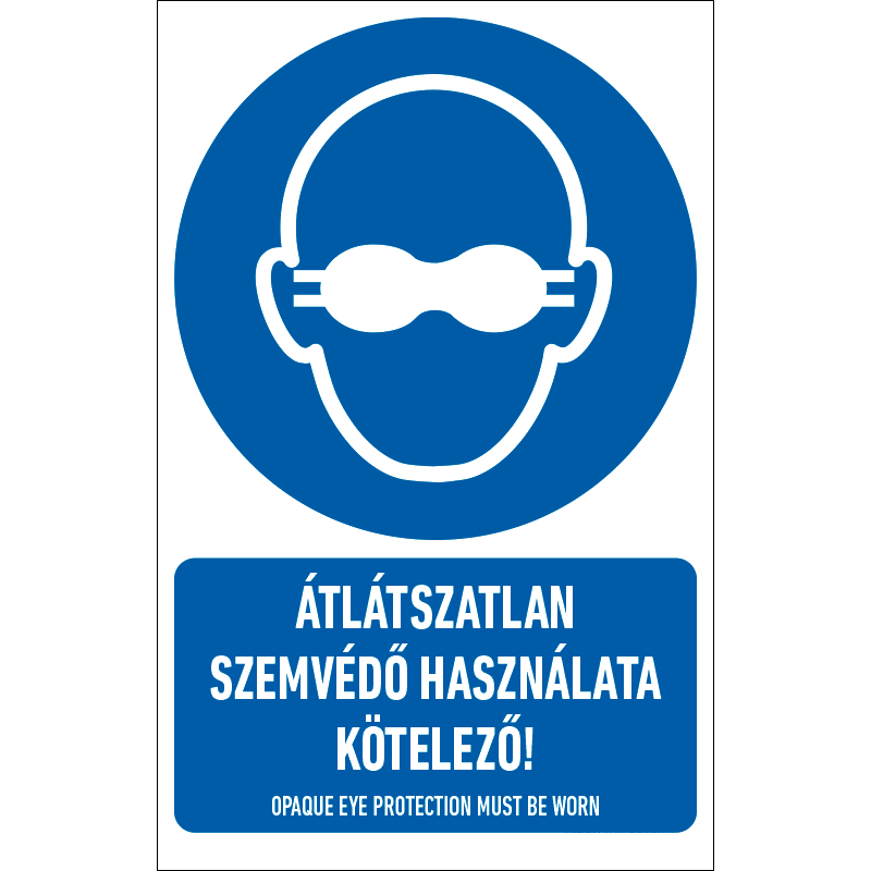 Az “Átlátszatlan szemvédő használata kötelező!” a biztonság és egészség védelmére vonatkozik: az átlátszatlan szemvédő használatát előíró kék alapon fehér piktogram+felirat.