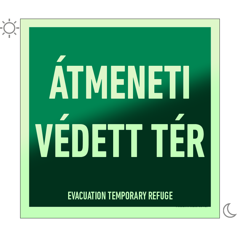 Az “Átmeneti védett tér” a tűz esetén az odamenekülő vagy -menekített személyek biztonságát átmenetileg, a mentés vagy a további menekülés végrehajtásáig biztosító területet jelző zöld alapon fehér piktogram.
