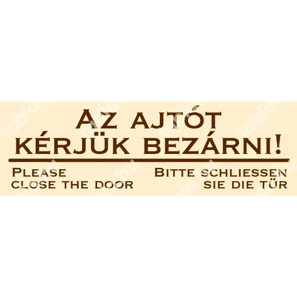 | Az ajtót kérjük bezárni! tábla (bézs/barna, három nyelvű) 250x80 mm UZT048001PVC02500080 | PVC 1 mm | 250 mm | 80 mm | 1 mm | db | 545 Ft | 692 Ft |