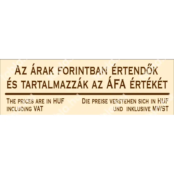 Ez a matrica egyértelműen jelzi, hogy az árak magyar forintban vannak megadva, tartalmazzák az Általános Forgalmi Adó (ÁFA) értékét is. Általában üzletekben, szolgáltatóknál vagy egyéb kereskedelmi helyeken használják, hogy tájékoztassák a vásárlókat az árak teljes összegéről, valamint, hogy biztosítsák az árak átláthatóságát.