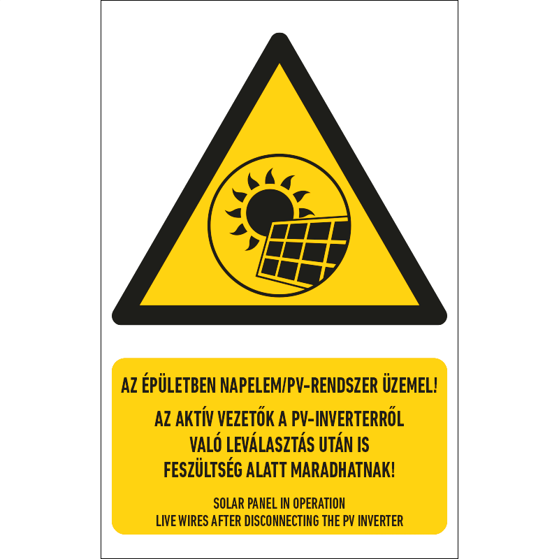 A “Az épületben napelem/PV-rendszer üzemel!” az épületben működő napelemes rendszer veszélyeire figyelmeztető piktogram+felirat.