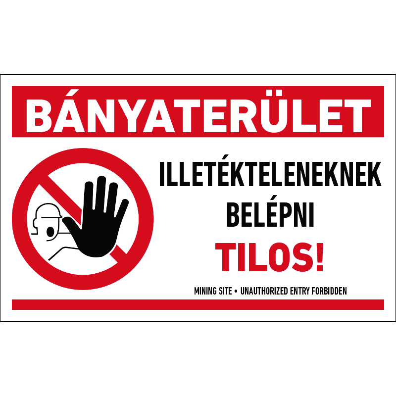 A “Bányaterület – Illetékteleneknek belépni tilos!” a felszíni bányaterületre történő belépést tiltó piktogram+felirat.