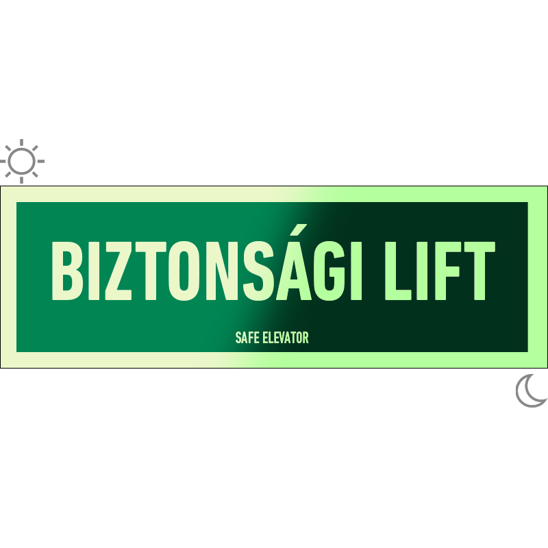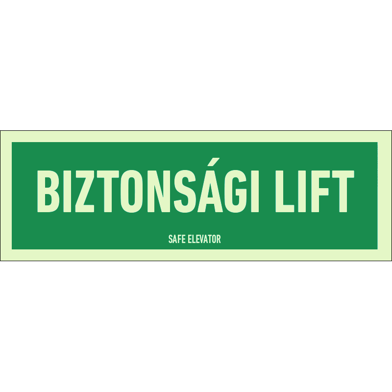 A “Biztonsági lift” az épület füstmentes lépcsőházához, tűzgátló előteréhez vagy a szabad térhez kapcsolódó, tűzoltói felügyelet mellett épülettűz alatt is üzemeltethető felvonóját sötétben utánvilágítva jelző zöld alapon fehér felirat.
