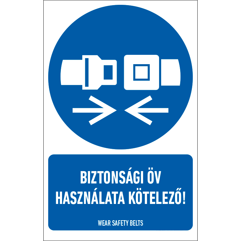 A “Biztonsági öv használata kötelező!” a biztonságra vonatkozik, a biztonsági öv használatát előíró kék alapon fehér piktogram+felirat.