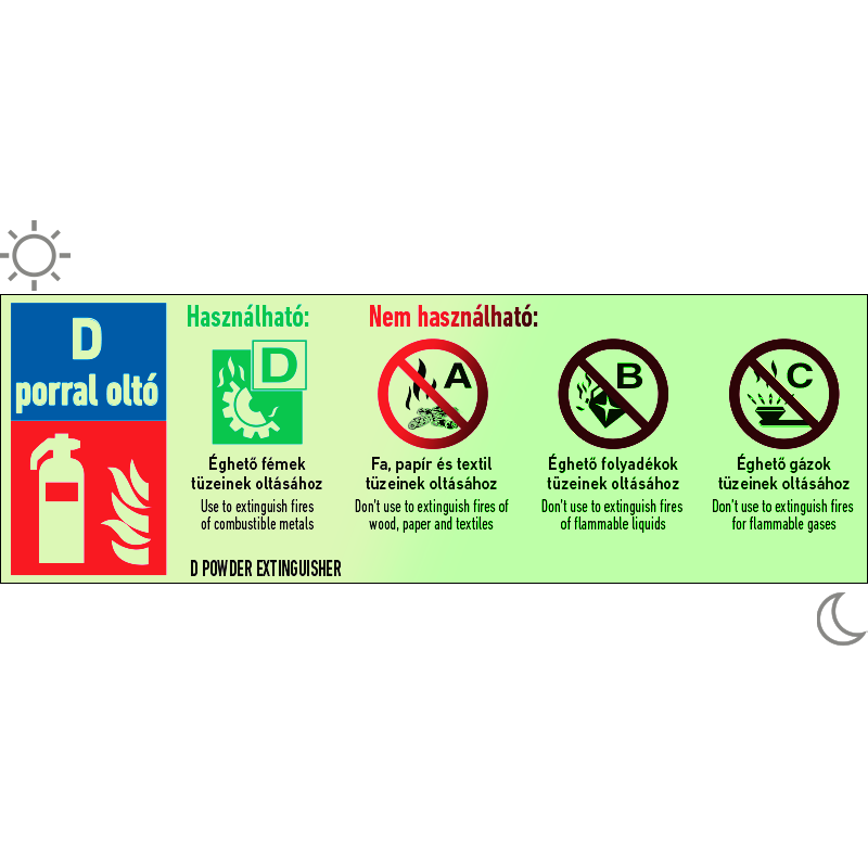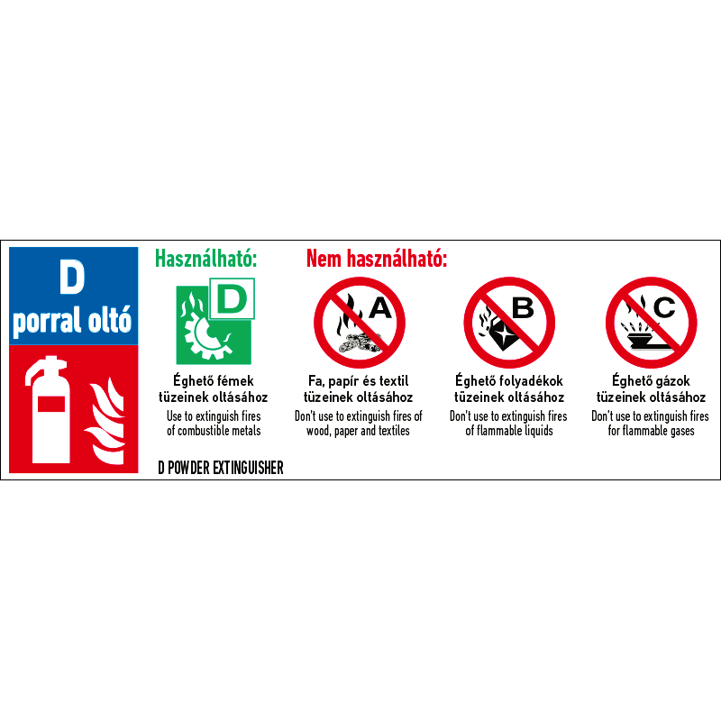 A “D porral oltó készülék” az égő fémek tüzének oltására alkalmas porral oltó tűzoltó készülék használatával kapcsolatos információkat tartalmazó piktogram+felirat.