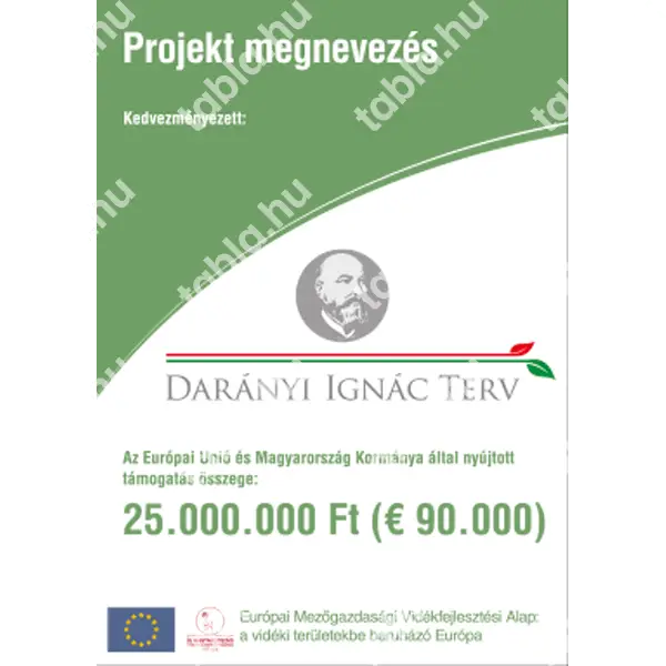A Darányi Ignác Terv projekttábla előre meghatározott arculati útmutató szerint készül. A nagy projekttábla (3000×1500 mm) mellett kétféle kis méretű „A” és „B” típus is rendelhető. Tartós, időjárásálló anyagból készült, biztosítva a hosszú távú használatot. Könnyen telepíthető és jól látható, professzionális megjelenést biztosít.