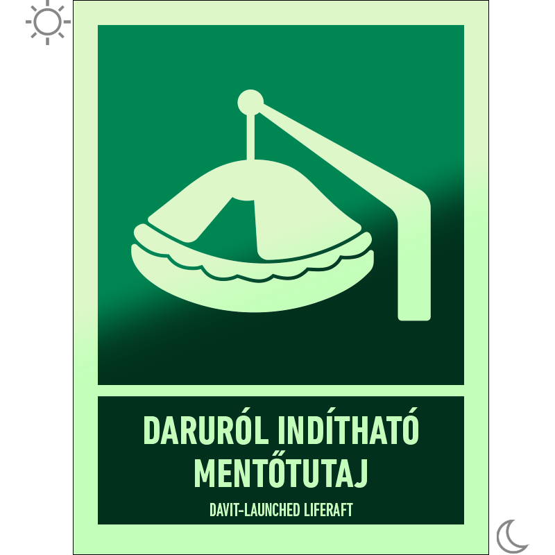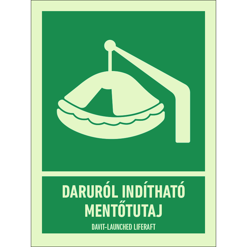 A “Daruról indítható mentőtutaj” a hajón található daruról indítható mentőtutaj helyét jelző zöld alapon fehér piktogram.