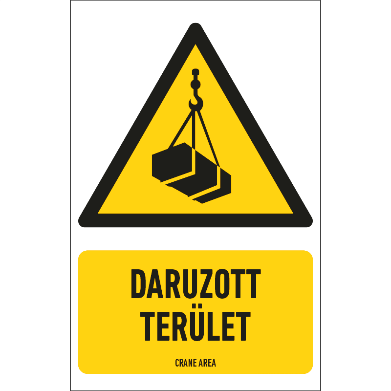 A “Daruzott terület” a daru által függesztve mozgatott teher okozta balesetveszélyre figyelmeztető piktogram+felirat.