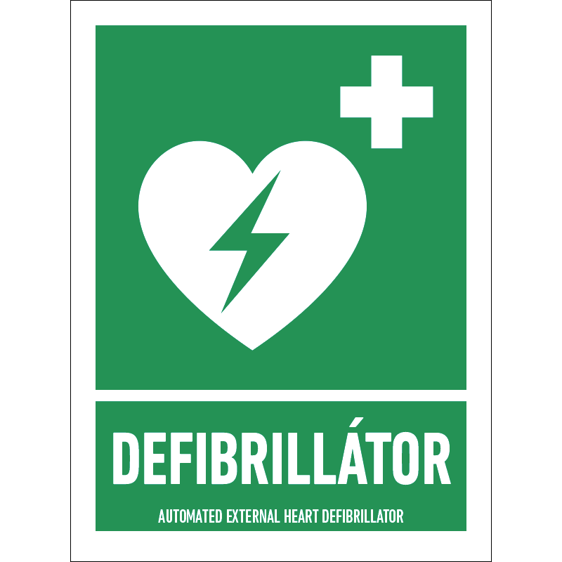 A “Defibrillátor” az újraélesztéshez segítséget nyújtó defibrillátor helyét jelző zöld alapon fehér piktogram.