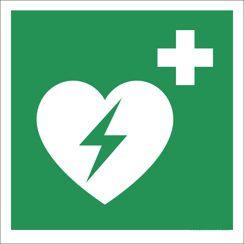 A “Defibrillátor” az újraélesztéshez segítséget nyújtó defibrillátor helyét jelző zöld alapon fehér piktogram.