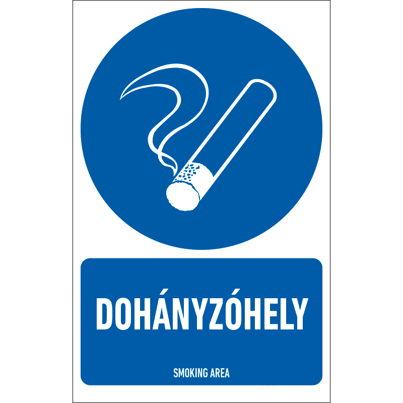 A “Dohányzóhely” a biztonságra és egészség védelmére vonatkozik, a dohányzóhelyet jelző kék alapon fehér piktogram+felirat.