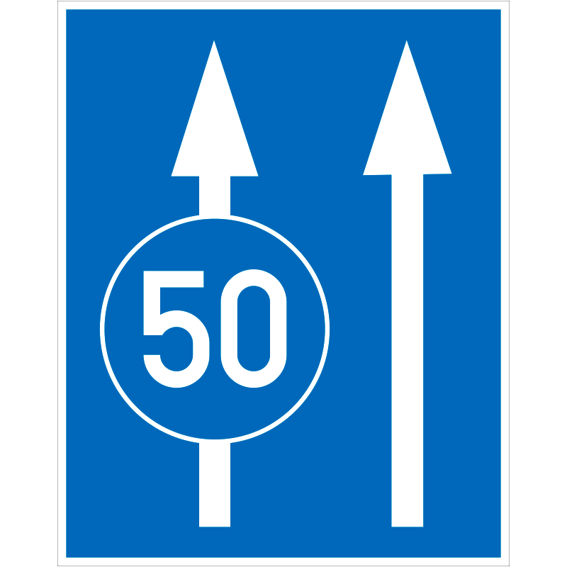 | Egy forgalmi sávra érvényes kötelező legkisebb sebesség KRESZ közlekedési tábla 800x1000 mm (2. fóliaosztály) gyorsforgalmi út, főút, főútvonal KZE004001HHI08001000 | horganyzott lemez + fényvisszavető fólia HI | 800 mm | 1000 mm | 1.99 mm | db | 30950 Ft | 39307 Ft |