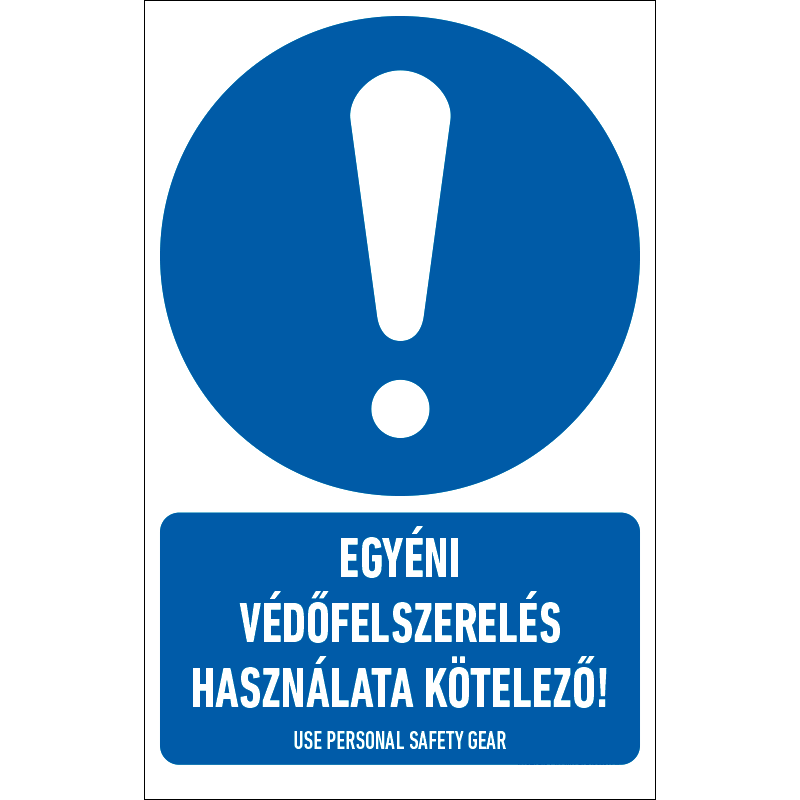Az “Egyéni védőfelszerelés használata kötelező!” a biztonságra és egészség védelmére vonatkozik, kék alapon fehér felkiáltójel piktogram+felirat.