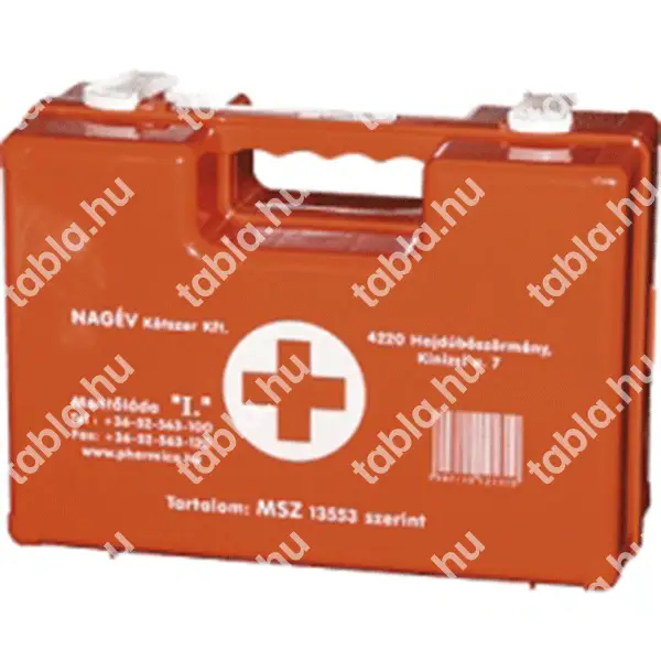 Elsősegély-felszerelés I. kategória. MSZ 13553 szabvány által meghatározott tartalmú munkahelyi elsősegély doboz.