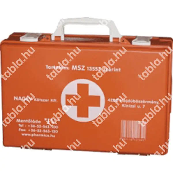 Elsősegély-felszerelés IV. kategória. MSZ 13553 szabvány által meghatározott tartalmú munkahelyi elsősegély doboz.