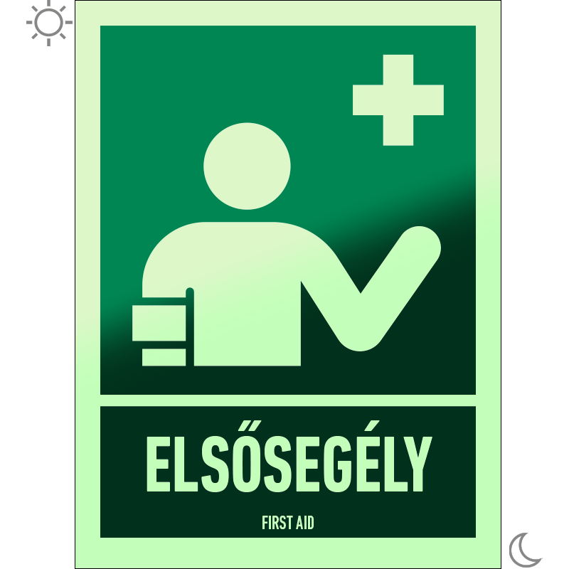 Elsősegély utánvilágító matrica (ISO 7010-E064 piktogram + felirat) 150x200 mm MET106002UTV01500200 utánvilágító öntapadó 150 mm 200 mm 0.5 mm db 1450 Ft 1842 Ft