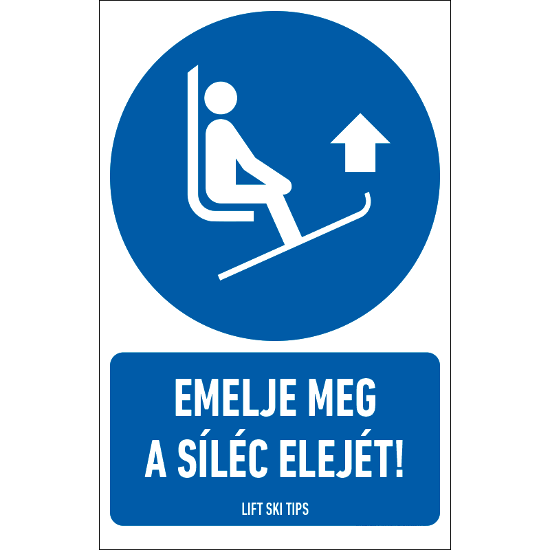 Az “Emelje meg a síléc elejét!” a biztonság és egészség védelmére vonatkozik: a sífelvonón a síléc emelését előíró kék alapon fehér piktogram+felirat.