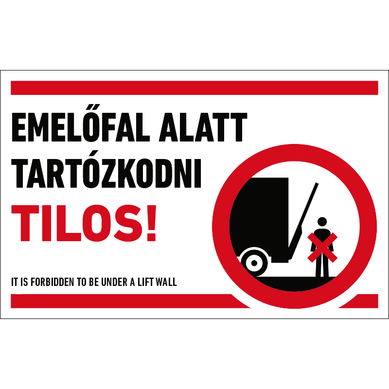Az “Emelőfal alatt tartózkodni tilos!” a teherautó emelőfala alatti tartózkodást tiltó piktogram+felirat.